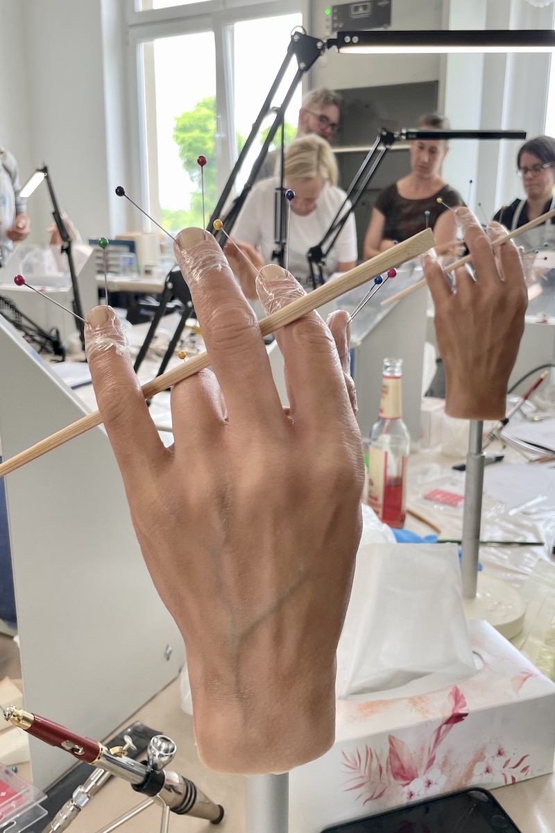 Außerdem erlernen die Teilnehmenden anhand einer zur Verfügung gestellten Silikonhand die verschiedenen Bemalungstechniken kennen und anwenden. Die Handhabung einer Airbrushpistole, deren Reinigung, sowie die Anwendung verschiedener Techniken wie sprühen und sprenkeln werden in diesem Seminar vermittelt und geübt. Außerdem werden Tipps zum Aufbau der Farbgestaltung vermittelt, die Verdünnung des Silikons, sowie die Reinigung der zu bemalenden Teile sind ebenfalls Thema.