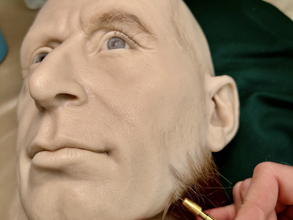 An einem Silikongesicht wird das Haare stechen erlernt.