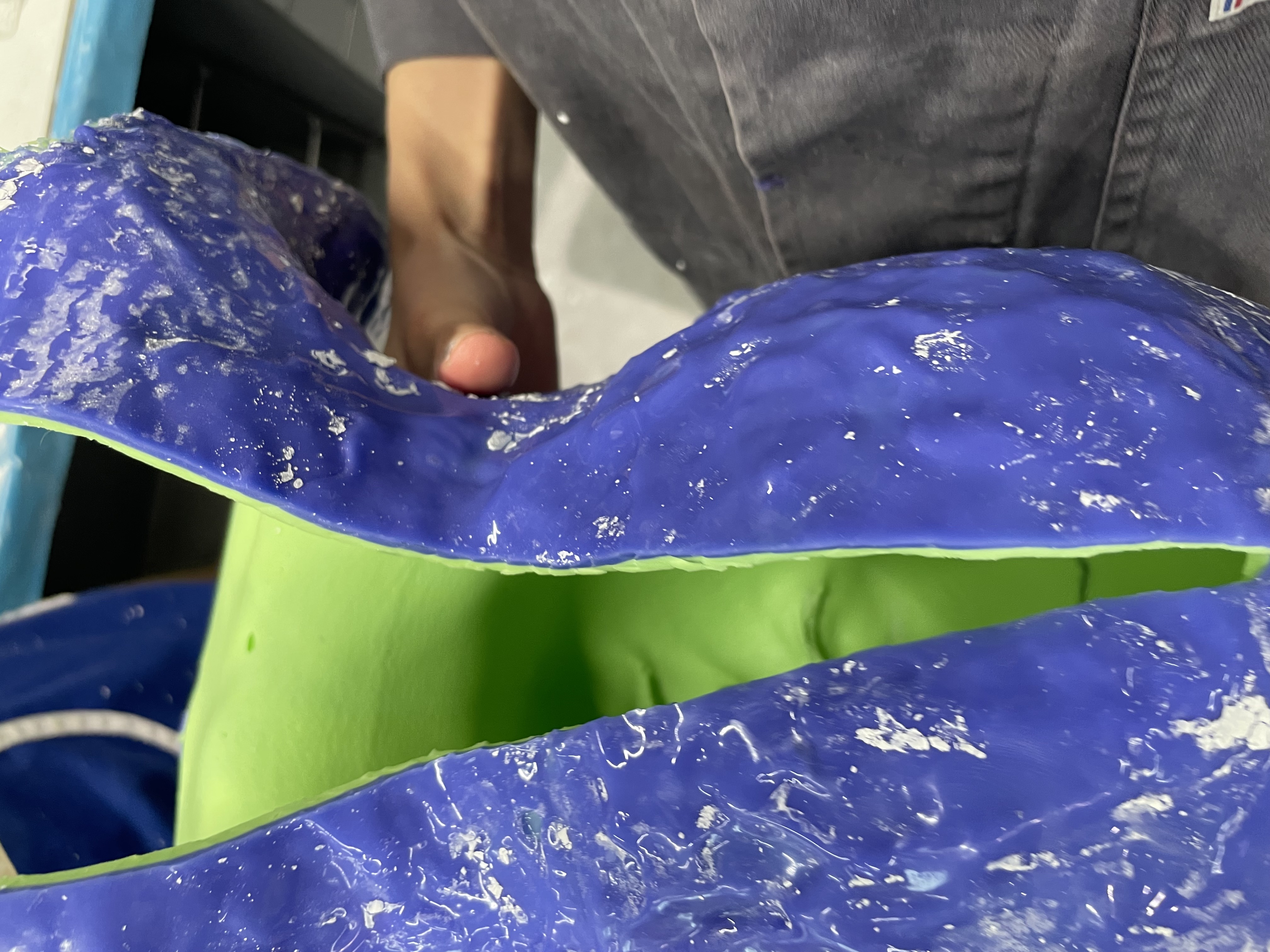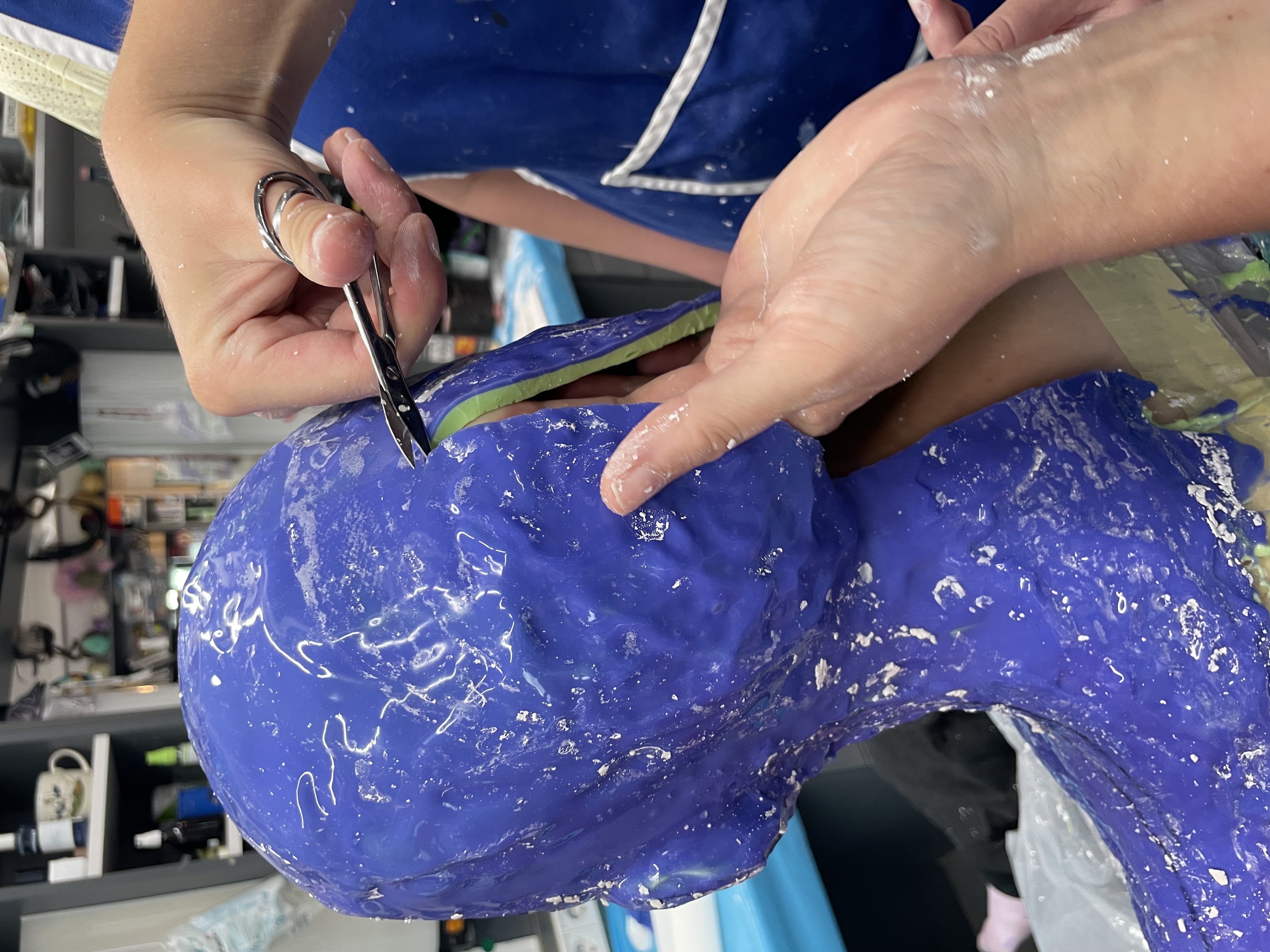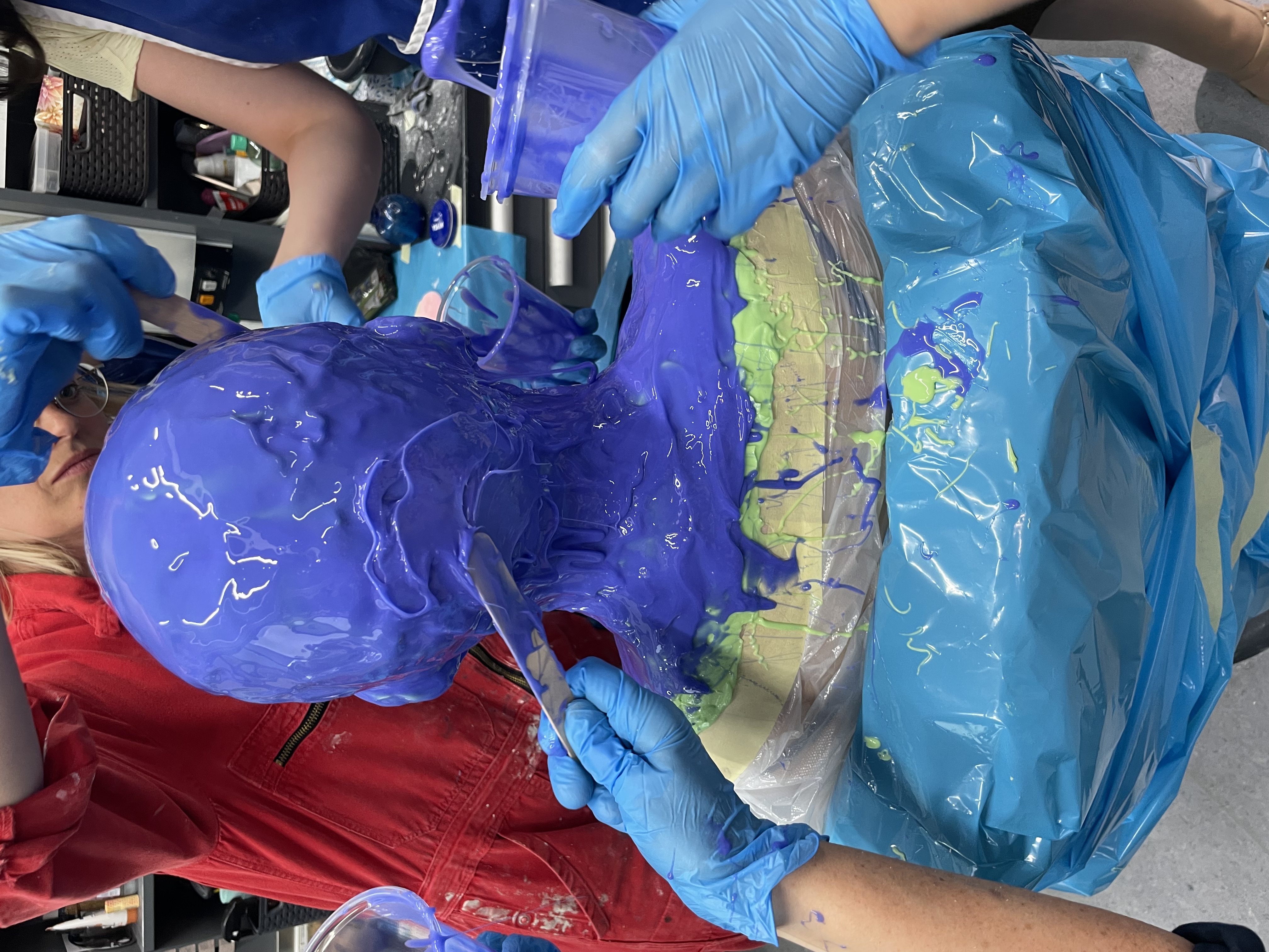 Wir arbeiten mit BODY DOUBLE SILK™ und BODY DOUBLE™, beides hervorragende und hautfreundliche Körperabformsilikone, die sich auch sehr gut in der Verarbeitung ergänzen. Verstärkt wird die Silikonnegativform mit Gipsbinden.