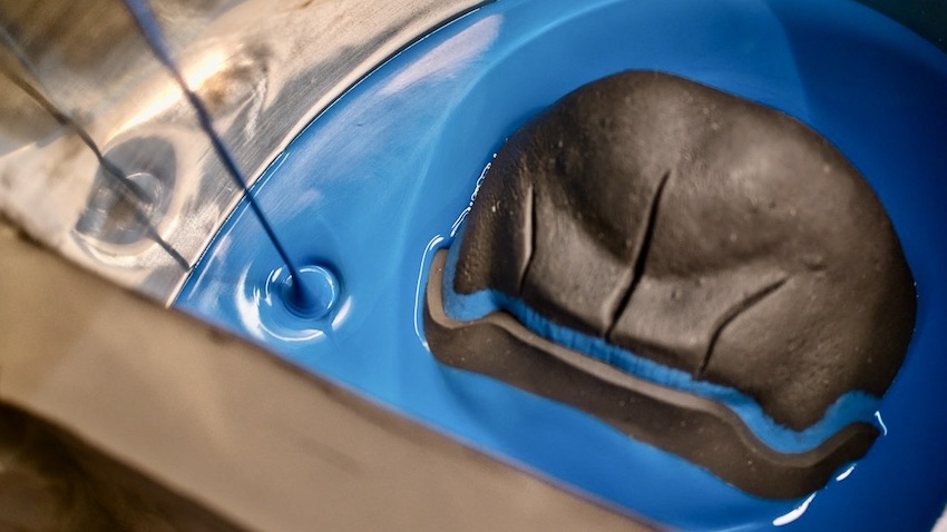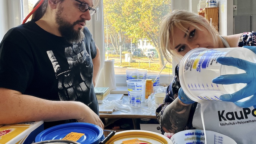 Am letzten Tag wird unter Berücksichtigung der Abreißkanten, von Schlössern und Überlaufkanälen die Negativform mit PU Harz angefertigt.