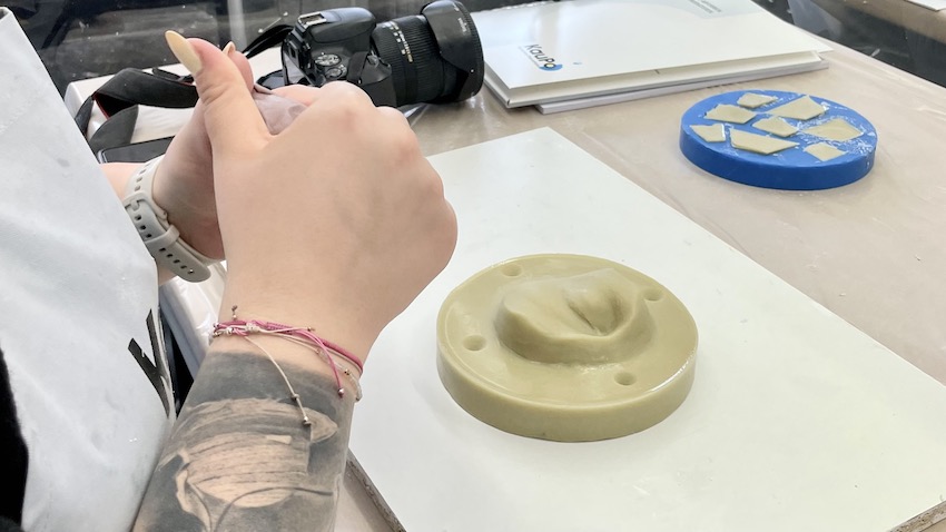 Anhand von einem Auge, Kinn oder Wange fertigen die Teilnehmenden ein Positiv (Core) aus PU Harz an. Dabei werden die unterschiedlichen Formen (konische Form, Flunchform, eingebettete Form) berücksichtigt und besprochen. Auch auf die Druckpunktachsen wird eingegangen.