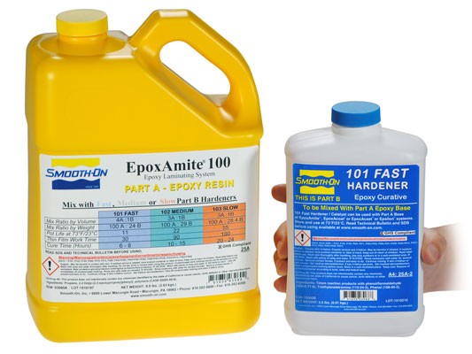 EPOXAMITE™ Laminating Systems are unfilled, low in viscosity, odorless liquid epoxies that can be used with reinforcements such as S-Glass, E-Glass, Kevlar and Carbon fibers for lay-up applications or composite parts. They display exceptional physical and performance properties and can be sanded, shaped, machined, drilled, tapped and painted. EPOXAMITE™ 100 Resin is color neutral, offers convenient mix ratios by volume and are compatible with Smooth-On‘s Dispensing Pump system. EPOXAMITE™ WHITE Resin is opaque and can be mixed with fillers such as fumed silica for creating gel coats.
