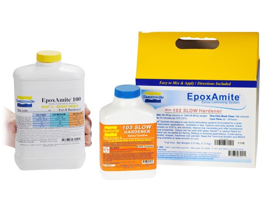 EPOXAMITE™ Laminating Systems are unfilled, low in viscosity, odorless liquid epoxies that can be used with reinforcements such as S-Glass, E-Glass, Kevlar and Carbon fibers for lay-up applications or composite parts. They display exceptional physical and performance properties and can be sanded, shaped, machined, drilled, tapped and painted. EPOXAMITE™ 100 Resin is color neutral, offers convenient mix ratios by volume and are compatible with Smooth-On‘s Dispensing Pump system. EPOXAMITE™ WHITE Resin is opaque and can be mixed with fillers such as fumed silica for creating gel coats.
