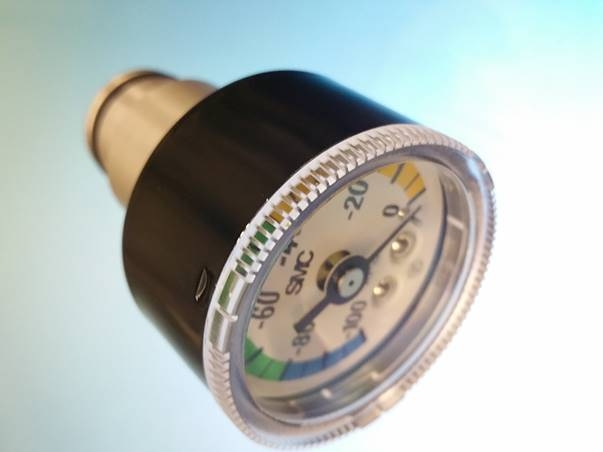 Combined vacuum gauge and plug in O ring sealed fitting. Allows insertion into mould bag insert to check vacuum level and security before infusion